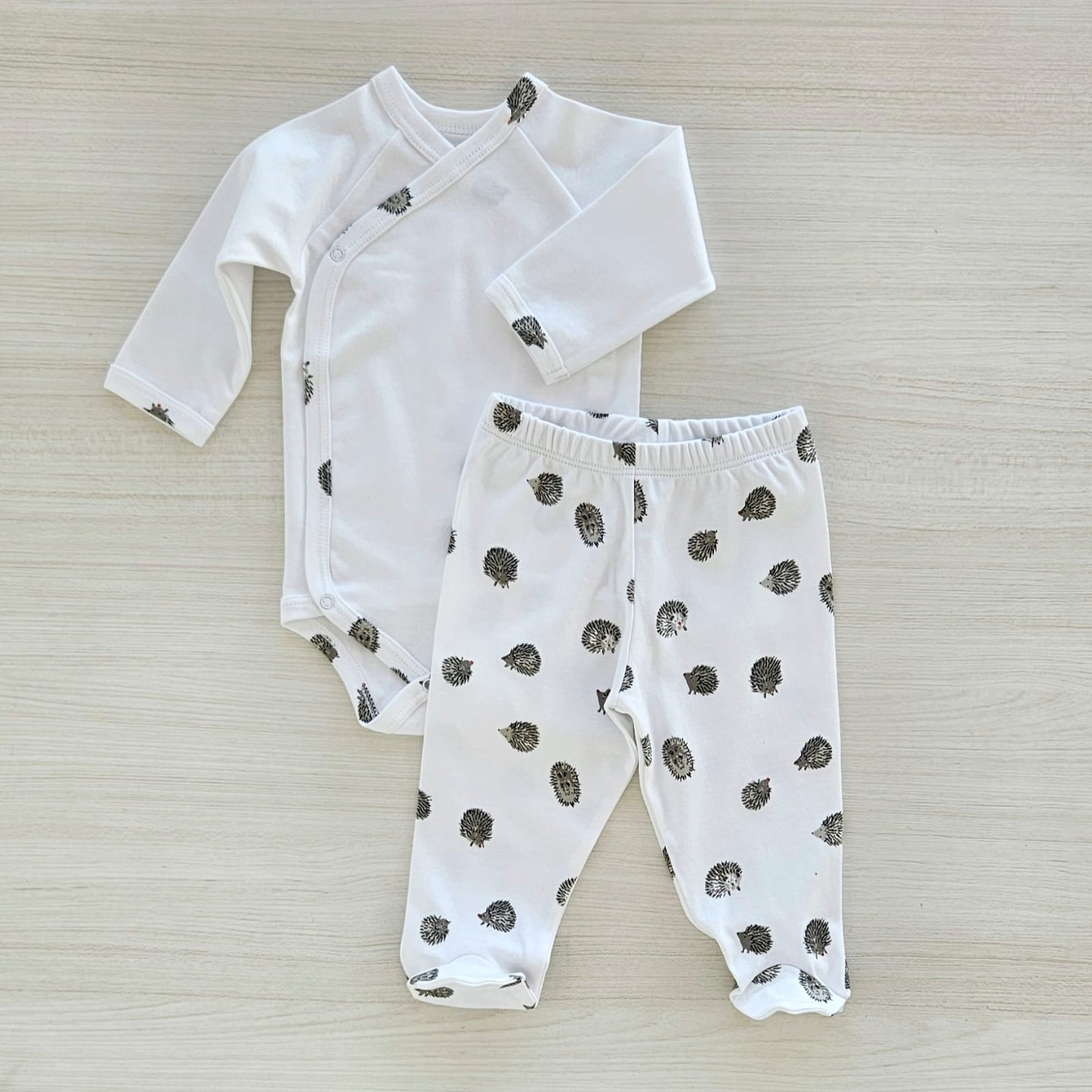 Our Hedgehog-themed two-piece set, featuring a cross-body top and footed pants, is skillfully made from organic Peruvian Pima cotton, ensuring exceptional softness and adorable style. Your little one will enjoy day-long comfort and a fashionable look. The pants are equipped with a gentle, non-constricting elastic waistband, ensuring your baby's waist remains snug without any discomfort.