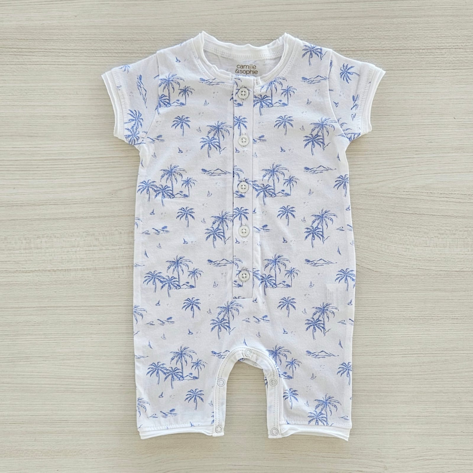 Our Palm Breeze Henley Romper is made for sunny days and seaside vibes. Crafted from ultra-soft organic Peruvian Pima cotton, it features a delicate palm tree and sailboat print in soft blue—bringing a coastal charm to your little one’s wardrobe. Designed for easy wear with front buttons and bottom snaps for quick changes.